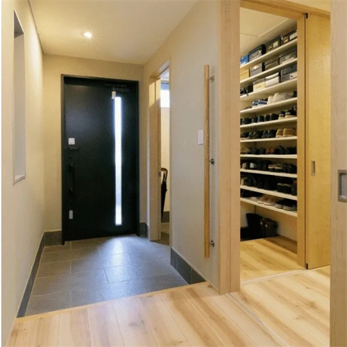 当下比较常穿的鞋子,我们往往不会很勤勉地把它收拾到鞋柜里,而下沉式玄关其实可视作一个模糊的放鞋区,且从远距离看,鞋子被会台阶挡住,室内也会显得整洁很多。