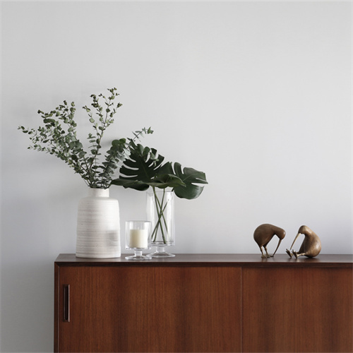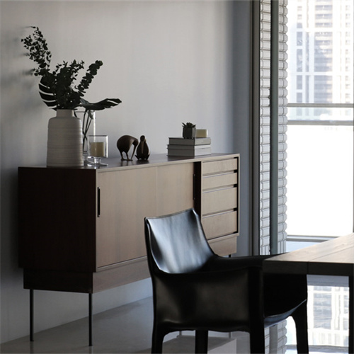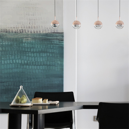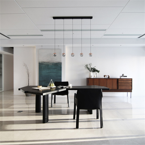 餐厅:不规则餐桌更有设计感,让人眼前一亮,吊灯设计新颖,整体风格搭配和谐。简单的餐边柜摆放一盆绿植,为室内带来了大自然的味道。