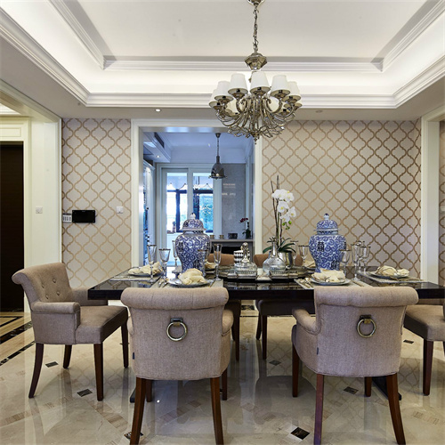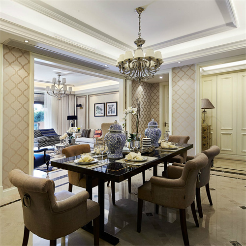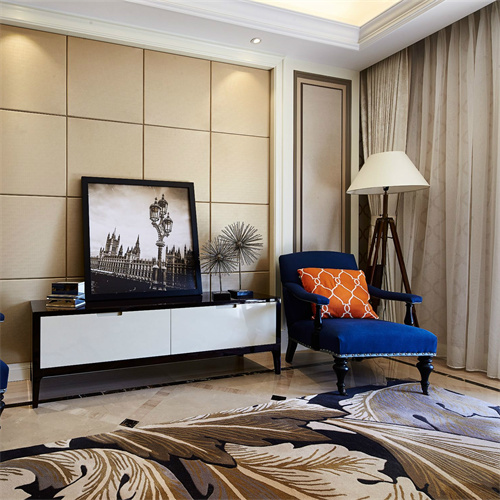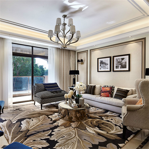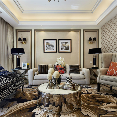 客厅:沙发背景墙主要采用凹凸不平的线条进行勾画,整体空间更具有立体感。华丽的吊灯,色彩鲜艳、图案繁复的地毯,雕刻精美的家具都尽显奢华。