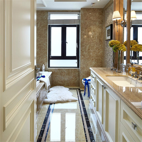 卫生间:整体采用大理石装修,可以为整个房间增添高端感和豪华感,让整个空间看起来更加美观大方。与其他材料相比,大理石更加容易清洁,可以用清水轻松擦拭污渍。