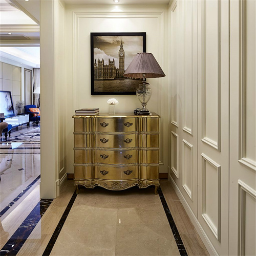 玄关:以白色为主要色调,以金色为辅。比较具有代表性的欧式大肚柜尽显北欧风情,墙上的装饰画为空间增加了层次感。