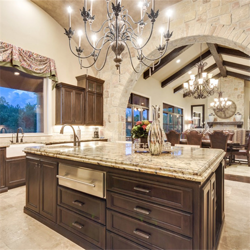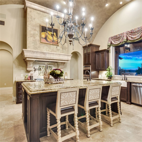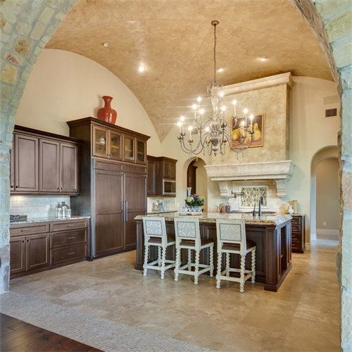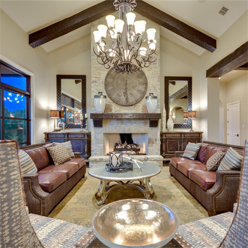 客厅:以奶白色为主色调,搭配红棕色,就像洒满阳光的海面和遥远的海岸线相互交织,充满了地中海风情。造型繁复的吊灯,对称的线条设计,客厅中央的壁炉,多彩的颜色搭配,给人一种在夕阳下看海的感觉。