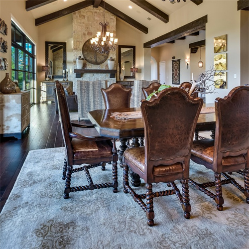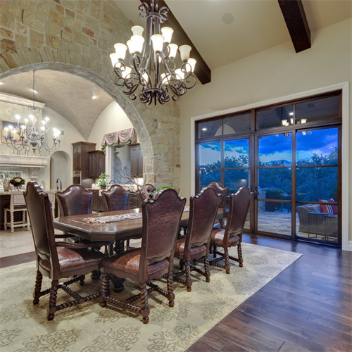 餐厅:选用自然原木长方形餐桌,高椅背餐椅,圆形的拱门、坡形屋顶让空间更通透流畅,可以透过玻璃门欣赏外面的风景,也阻挡了外面的灰尘。