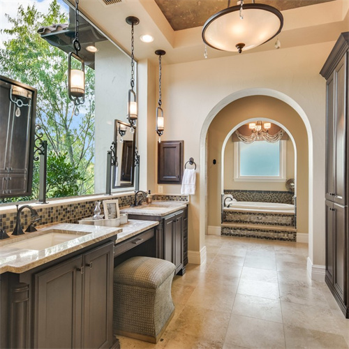 卫生间:洗漱台和化妆台一体,更节省梳妆时间,淋浴间和浴缸单独做一个区域,干湿分离很好的避免了细菌滋生的问题。