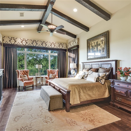 卧室:原木地板、原木床架、原木床边柜,实木横梁把追求自然做到了极致,每天拉开窗帘就可以看到窗外美景。