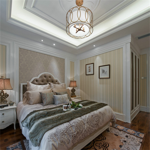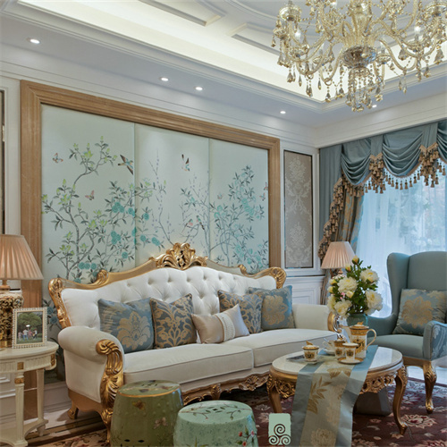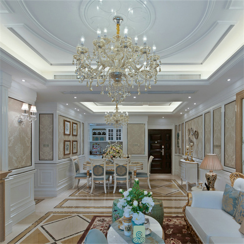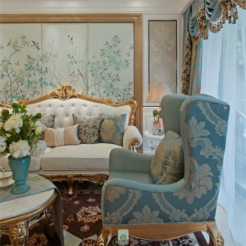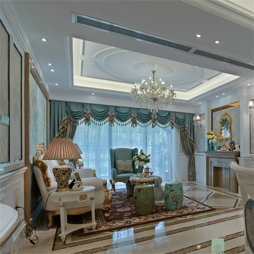 客厅:运用柔和的浅色调来呈现舒适的浪漫感,高雅古典的线条形塑出古典高雅的氛围感,造型复杂的吊灯和壁灯,满满宫廷风元素的窗帘为整体又增添了一分庄重感。