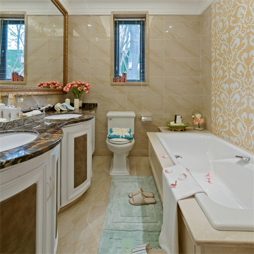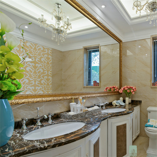 卫生间:洗手台优美的弧形线条,台面的绿植盆栽,光滑的大理石,增添了一丝优雅的氛围感,精美的壁画格外亮眼,增强了装饰效果。