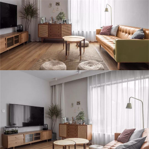 客厅:整体是浅色系色调,搭配原木家具和原木地板,看起来干净通透,简洁质朴,落地灯更是增加了氛围感,室内的绿植表达了崇尚自然的设计理念,
