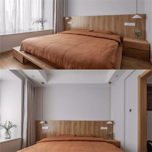 卧室:造型简洁,装饰点缀较少, 床榻选地台床,床体与地面相连,底部可以作为收纳空间使用。整体空间呈现出朴实与自然,更有层次感。